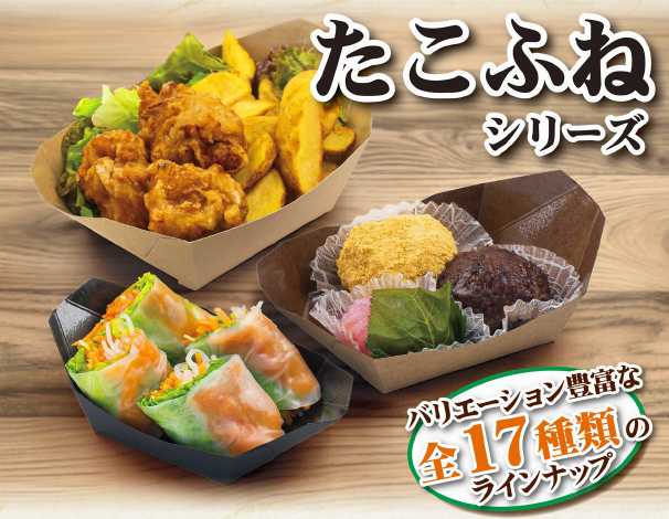 この「たこふねシリーズ」は、お客様のテイクアウト商品の高級感アップと使い勝手の向上に貢献する、魅力的な提案です。
