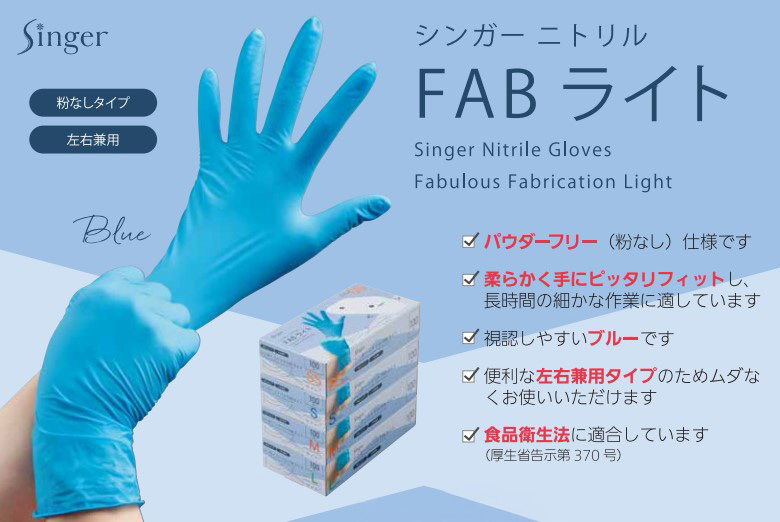 この「シンガー ニトリル FAB ライト」は、お客様の現場の衛生管理と、作業者様の快適性を高め、トータルコストの削減にも貢献する、戦略的な主力商品です。