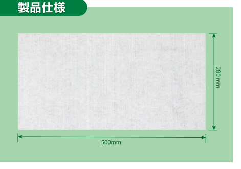 原紙サイズは500mm×280mmの超大判サイズ。一枚で全身の拭き取りに対応できるため、使用枚数を削減し、コスト削減に貢献します。高品質スパンレース素材