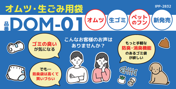 今回は、そうした市場の声に応える、サンキョウプラテックの「オムツ・生ごみ用袋 DOM-01」をご紹介します。「低価格」と「防臭・消臭機能」を両立し、幅広い顧客層へ提案できる画期的な製品です。