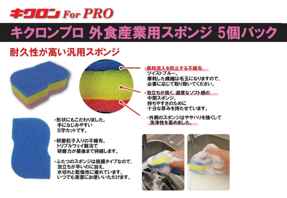 衛生管理とコスト効率の両立を実現する「キクロンプロ 外食産業用スポンジ」は、お客様の現場の必需品となること間違いありません。ぜひ主力商材としてご検討ください。