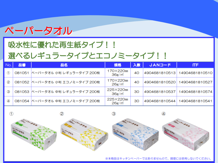 - 厚みの選択: コストか吸水性か、お客様の優先順位に合わせてエコノミーかレギュラーを選びます。