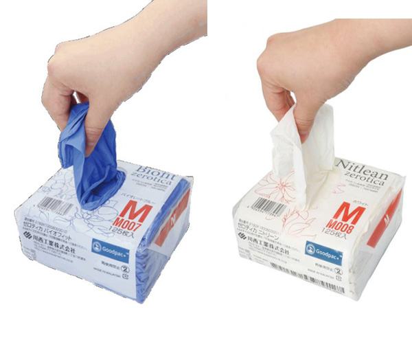 M007・M008は、ポップアップ式(Goodpac+)の梱包を採用しています。これは、手首部分から片手で1枚ずつサッと取り出せる方式です。