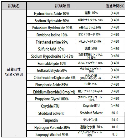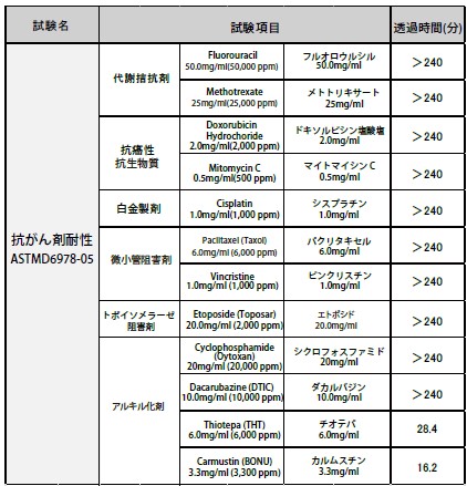 ASTM D6978-05ïŒæããå€èæ§è©ŠéšïŒã«ãããŠãå€ãã®è¬å€ã§ééæéã240å以äžãšããçµæãåºãŠããŸãã
