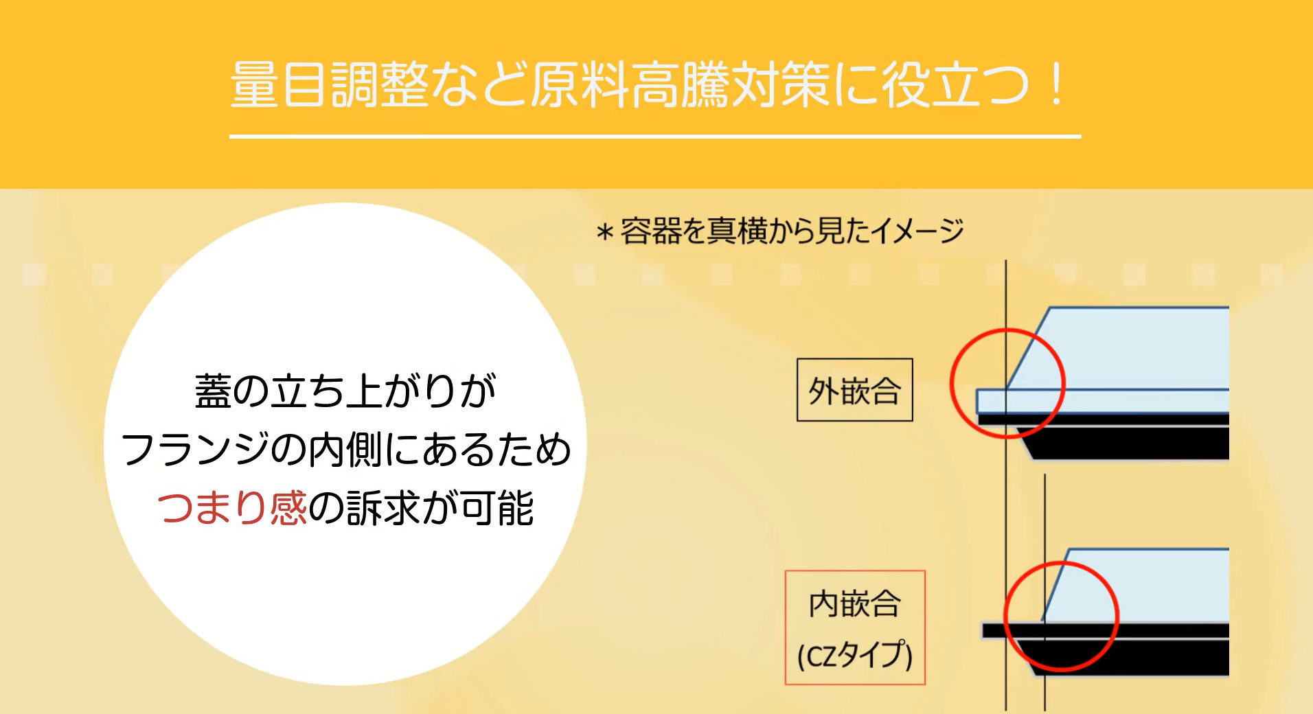 - つまり感の訴求:蓋の立ち上がりがフランジ(フチ)の内側にある「内嵌合」を採用。容器のフチまで具材が入っているような ボリューム感を演出できます。