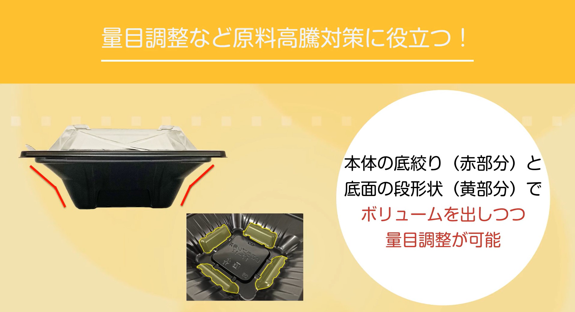 本体の底絞り(赤部分)と底面の段形状(黄部分)の工夫により、ボリューム感を出しつつ量目の調整が可能です。昨今の原材料高騰に対し、見栄えを損なわずにコストコントロールしたい店舗への強力な提案材料になります。