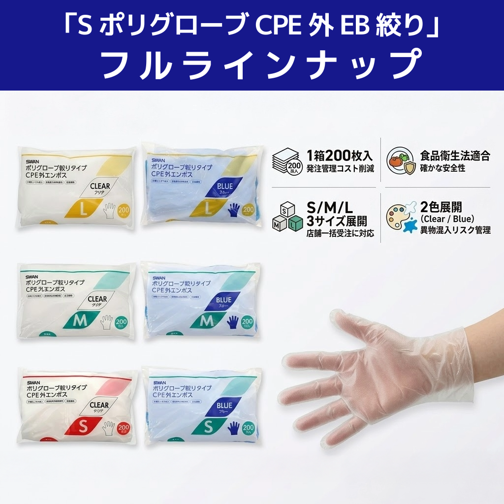 消耗品の安定受注は経営の要と言えます。利益を確保し、売上を伸ばすためのカギはリピート商材の選定にあるのではないでしょうか。 今回の主役は、シモジマの「SポリグローブCPE外EB絞り」です。 これは単なる使い捨て手袋ではありません。現場の不満を解決し、卸業者の継続的な収益源となる戦略的アイテムとして期待できます。