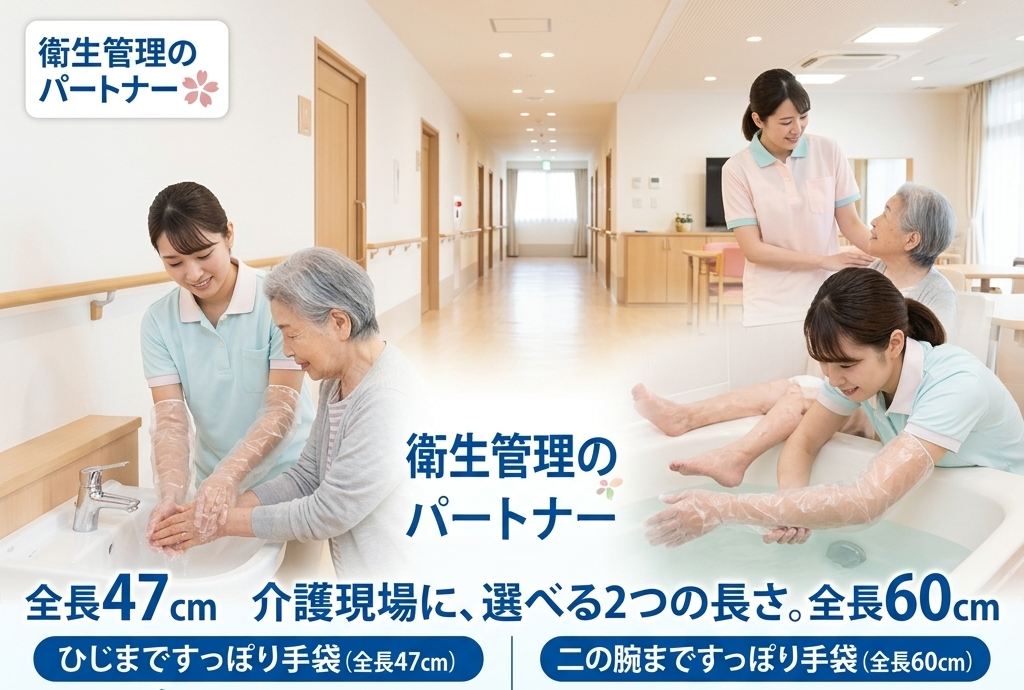 • 入浴介助や排泄介助など、腕まで汚れるリスクがあるシーンで衛生的に使用できます。