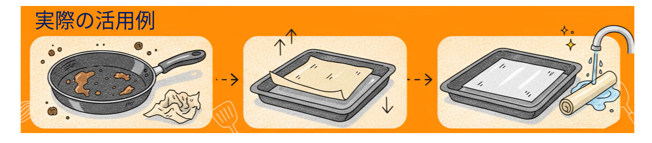 • ステンレス製のホテルパン(業務用容器)に敷くだけで、高価なテフロン加工容器と同等の性能を安価に再現できます 。