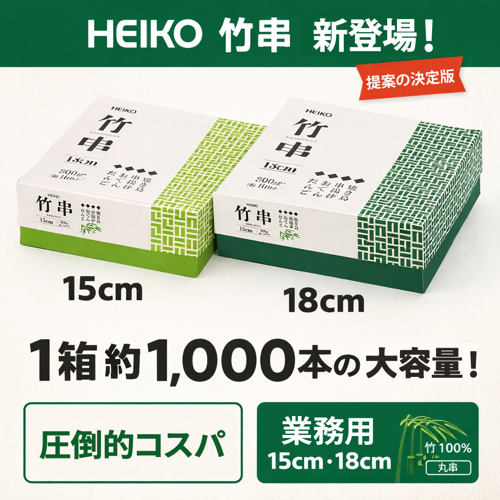 HEIKOブランドの新しい竹串は、飲食店の在庫管理の簡略化とコスト削減を同時に実現できる、非常に実用性の高い商材です。15cmと18cmの2サイズ展開により、店舗の主力メニューに合わせた的確な提案が可能となります。日々の営業活動において、顧客の店舗運営の無駄を省く具体的な解決策として、提案のきっかけを作ってみてはいかがでしょうか。