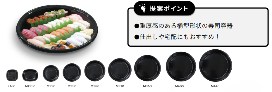 「HS桶」や「角皿」など、寿司から刺身、オードブルまで対応できる豊富なラインナップが揃っています。売場全体を「BK」で統一することで、売場に重厚感を演出できます。