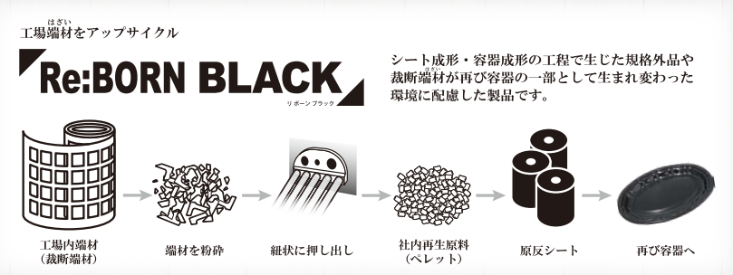 「Re:BORN BLACK」は、容器を製造する際に出る端材をリサイクルして作られた、環境負荷の低いサステナブルな容器です。