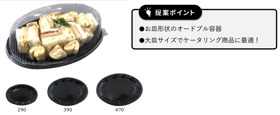 お皿のような形状をしたオードブル容器であり、大皿サイズが必要とされるケータリング商品やパーティーメニューの提供に最も適した選択肢です。