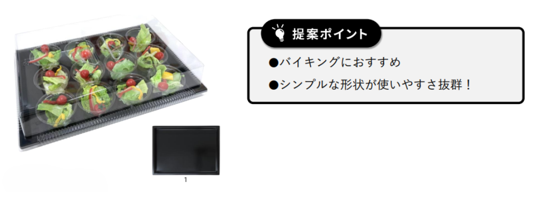 黒色は視覚的に食材の赤や緑、黄色を最も鮮やかに引き立てる色です。盛り付けを変えずに、容器を「BK」に変えるだけで商品の美味しそうな表情を引き出せます。