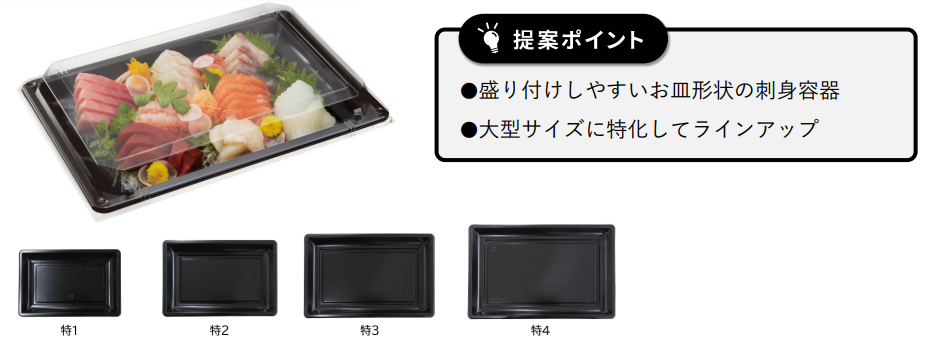 盛り付けのしやすさを追求したお皿形状の刺身容器で、特に大型サイズに特化しているため、量販店などの刺身盛り合わせコーナーで威力を発揮します。