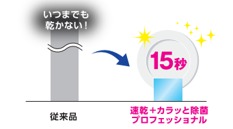 • 圧倒的な速さで乾くため、水あかが残りにくく、グラスや食器を「カラッと」清潔に保つことが可能です。