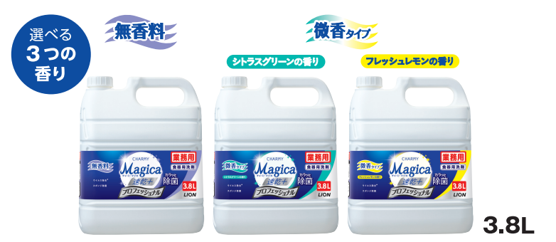 調理の邪魔をしない「無香料」に加え、現場の空気を爽やかにする微香性の「シトラスグリーン」「フレッシュレモン」があり、厨房環境に合わせた柔軟な提案が可能です。