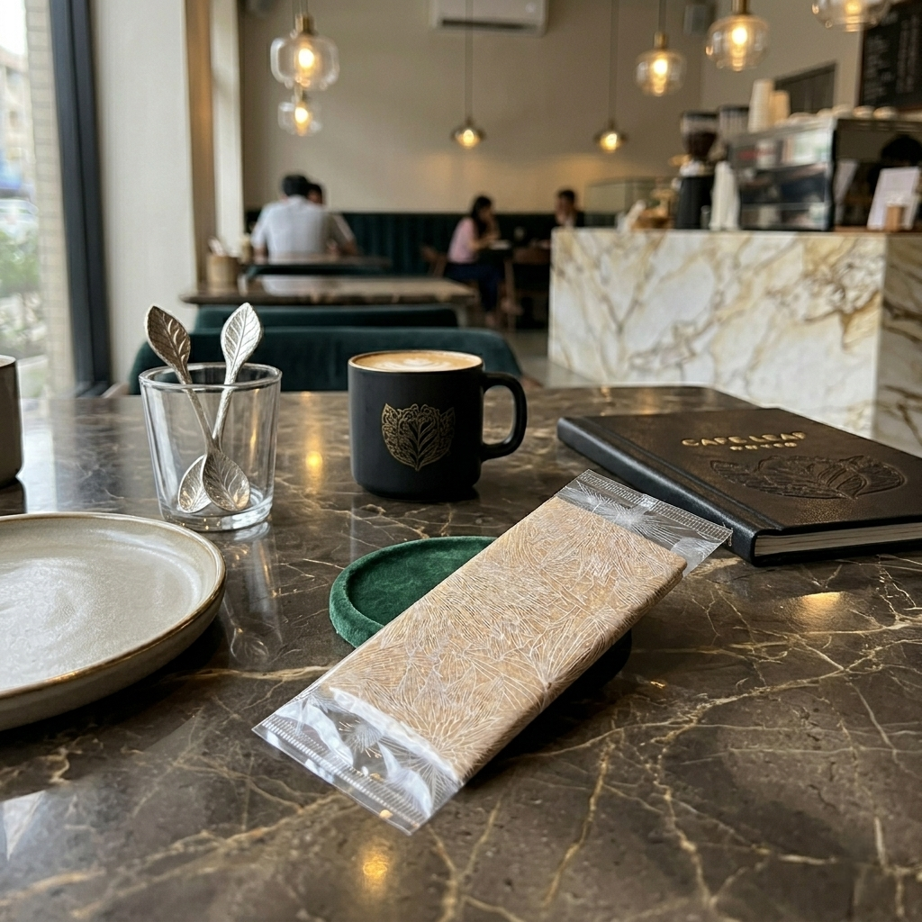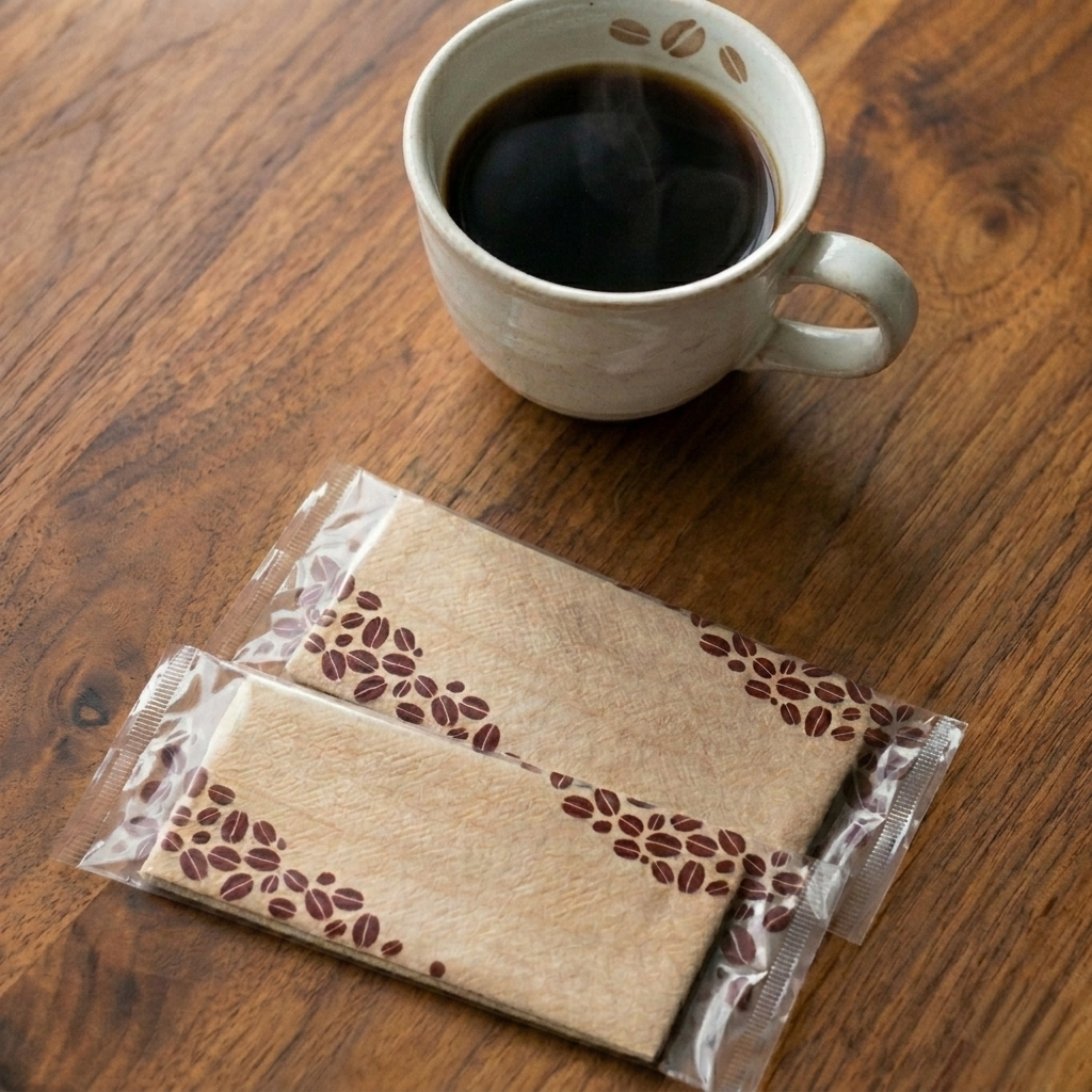 ナチュラルやシックな内装を重視するバーやレストランにとって、真っ白な紙おしぼりは空間から浮いてしまうノイズになりがちです。本製品は、木目調のテーブルや温かみのある照明と相性が良く、店舗の世界観を資材レベルで統一することを可能にします。
