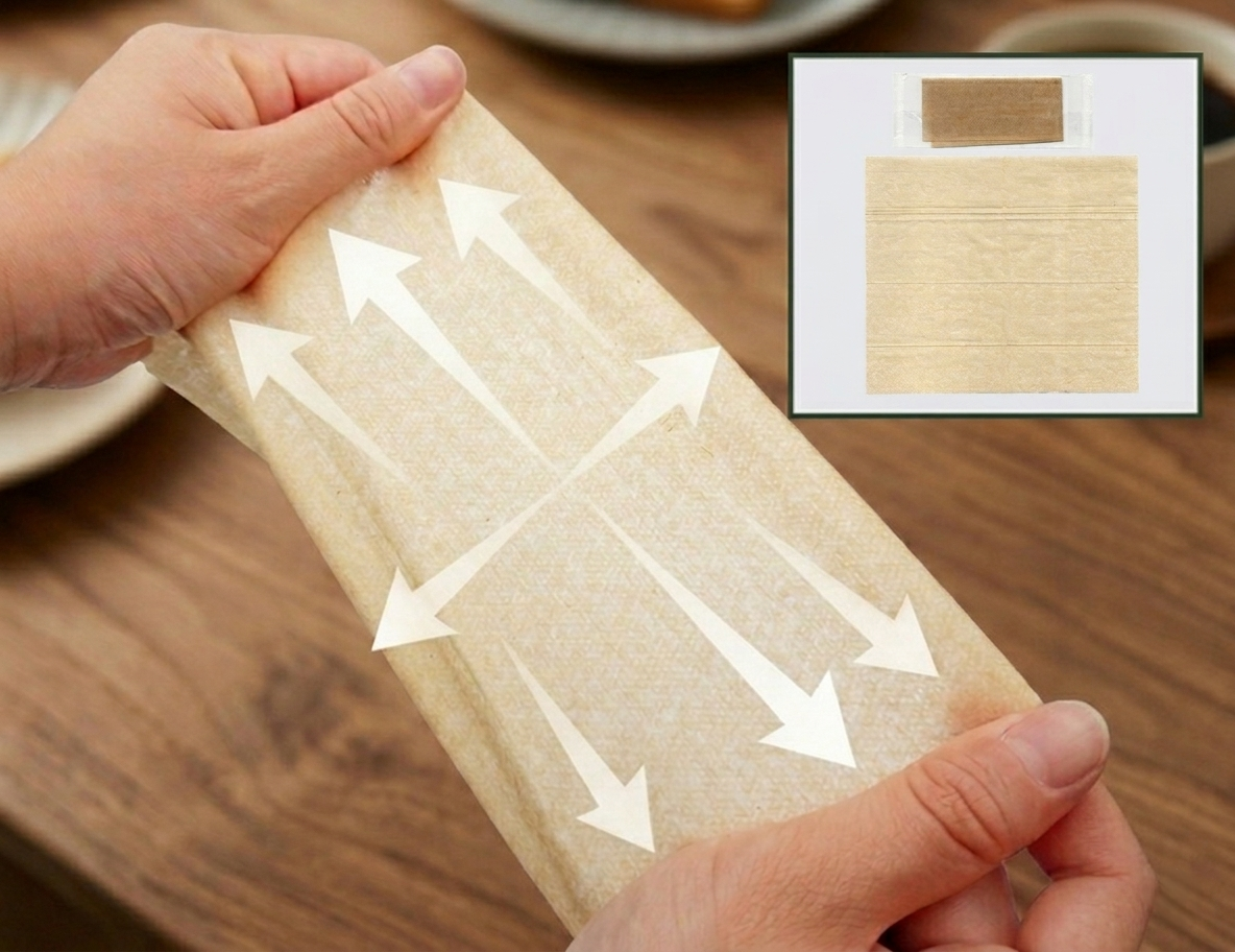 お弁当の格を上げる資材として、未晒しの高級感は有効です。食品パッケージにこだわる店舗に対し、消耗品でも一貫した世界観を提案することで、競合の入り込む隙を与えません。また、企業の応接やサロンでの茶出しにおいても、布おしぼりに近い質感が、おもてなしの質を担保します。